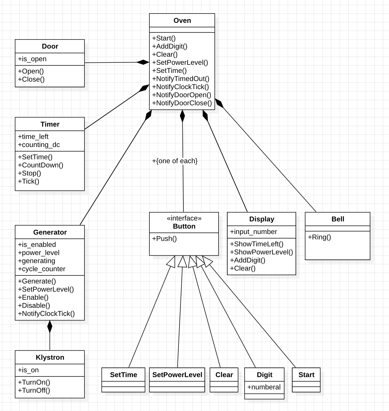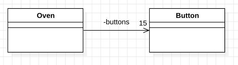 Oven이 Button을 사용하고 있으므로 클래스 다이어그램은 Oven에서 Button으로 화살표가 향하도록 그려준다. 이때, buttons 앞에 -가 붙은 것을 볼 수 있는데 이것은 접근제어자라고 한다. 접근제어자란, Oven이 Button을 어떤 식으로 접근하고 있는지 표현하는 것인데 그림은 private 인 경우다. 그리고 소스코드와 그림 2에서 객체가 15개 연결되어 있다. 클래스 다이어그램에서는 15 숫자만 작성해 주면 된다.