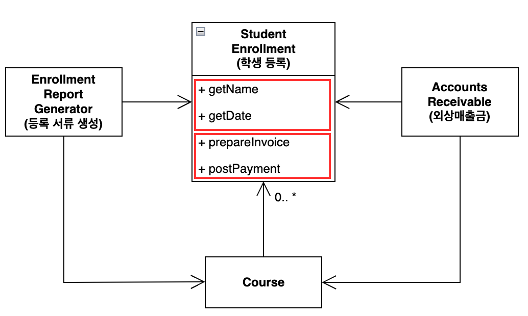 왼쪽의 EnrollmentReportGenerator 클래스는 getName()과 getDate()만 필요하고 오른쪽의 AccountsReceivable 클래스는 prepareInvoice()와 postPayment()만 필요하지만 현재 4개의 메서드가 StudentEnrollment에 함께 존재한다. 그래서 불필요한 메서드에 의존관계가 존재한다. postPayment() 메서드에 새 인자를 추가한다면 StudentEnrollment의 선언을 바꾸는 것이고 결국 EnrollmentReportGenerator 클래스를 다시 컴파일하고 배포해야 할 수도 있다.
