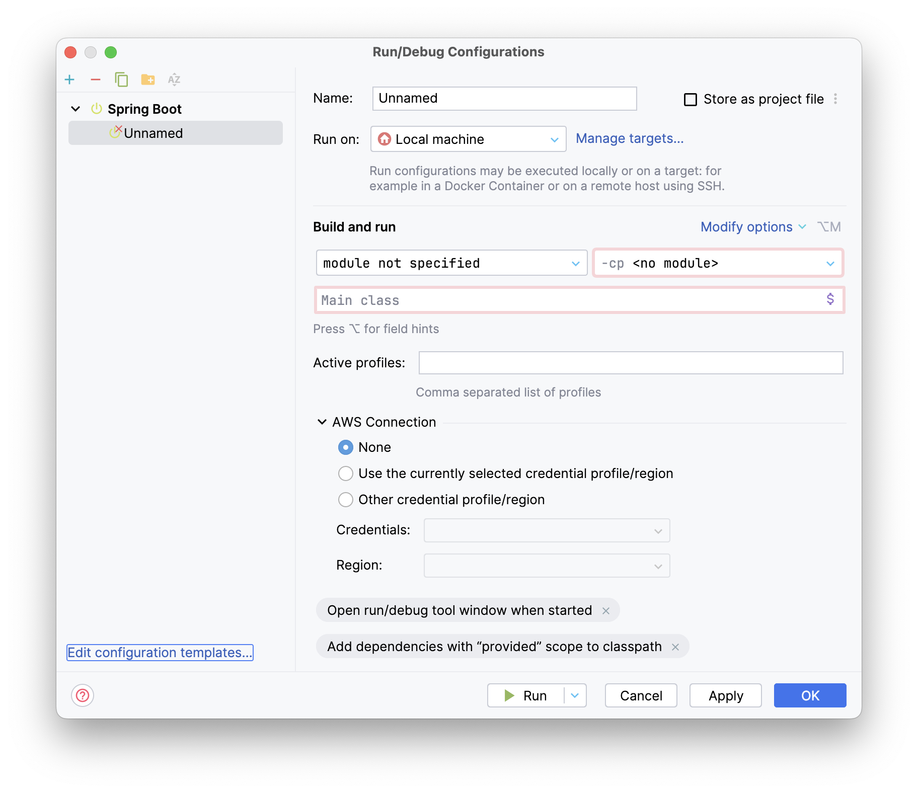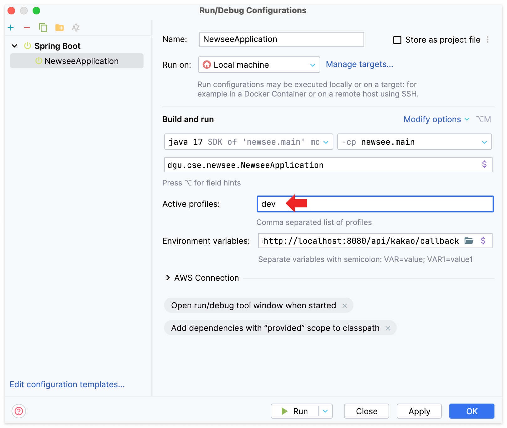 그럴 때는 똑같이 환경변수를 저장하고 Active profiles에 활성화할 yml 파일의 이름을 명시하면 됩니다.