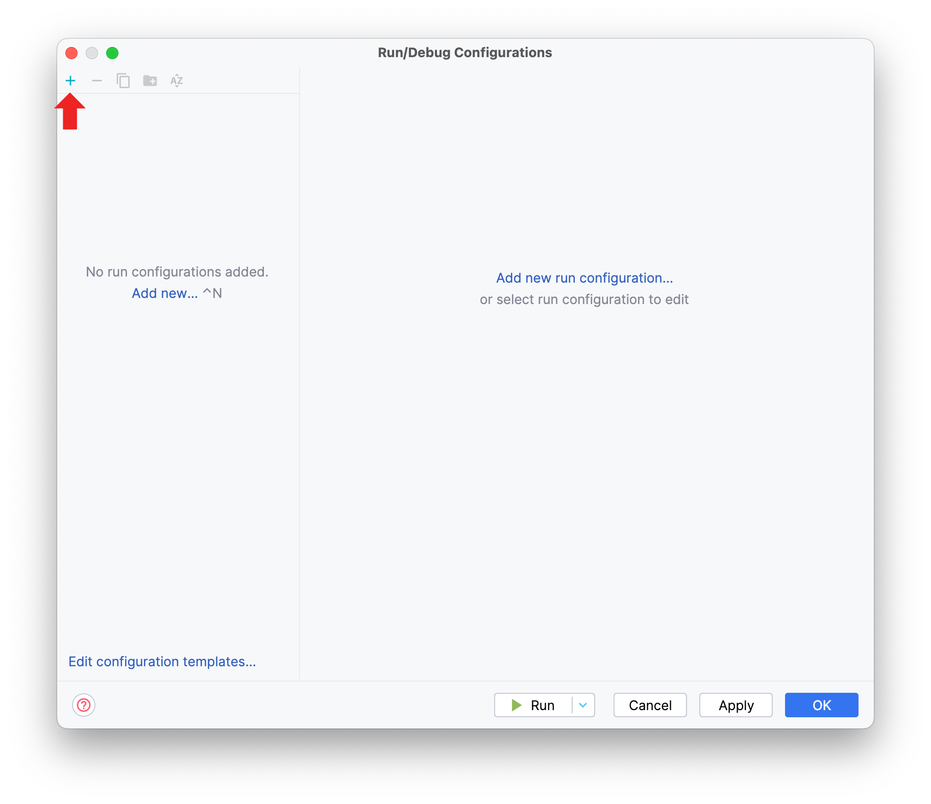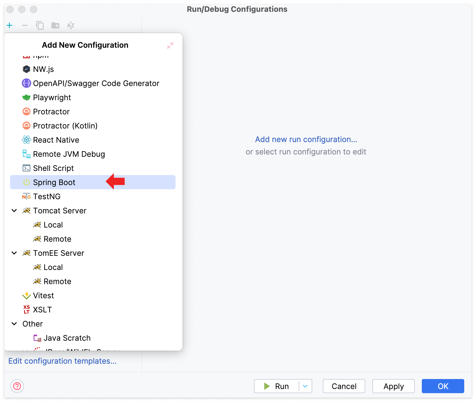 아무 것도 없는 경우에 + 버튼을 클릭하여 Configuration을 설정해주겠습니다. 현재 프로젝트의 종류에 맞게 SpringBoot를 클릭합니다.
