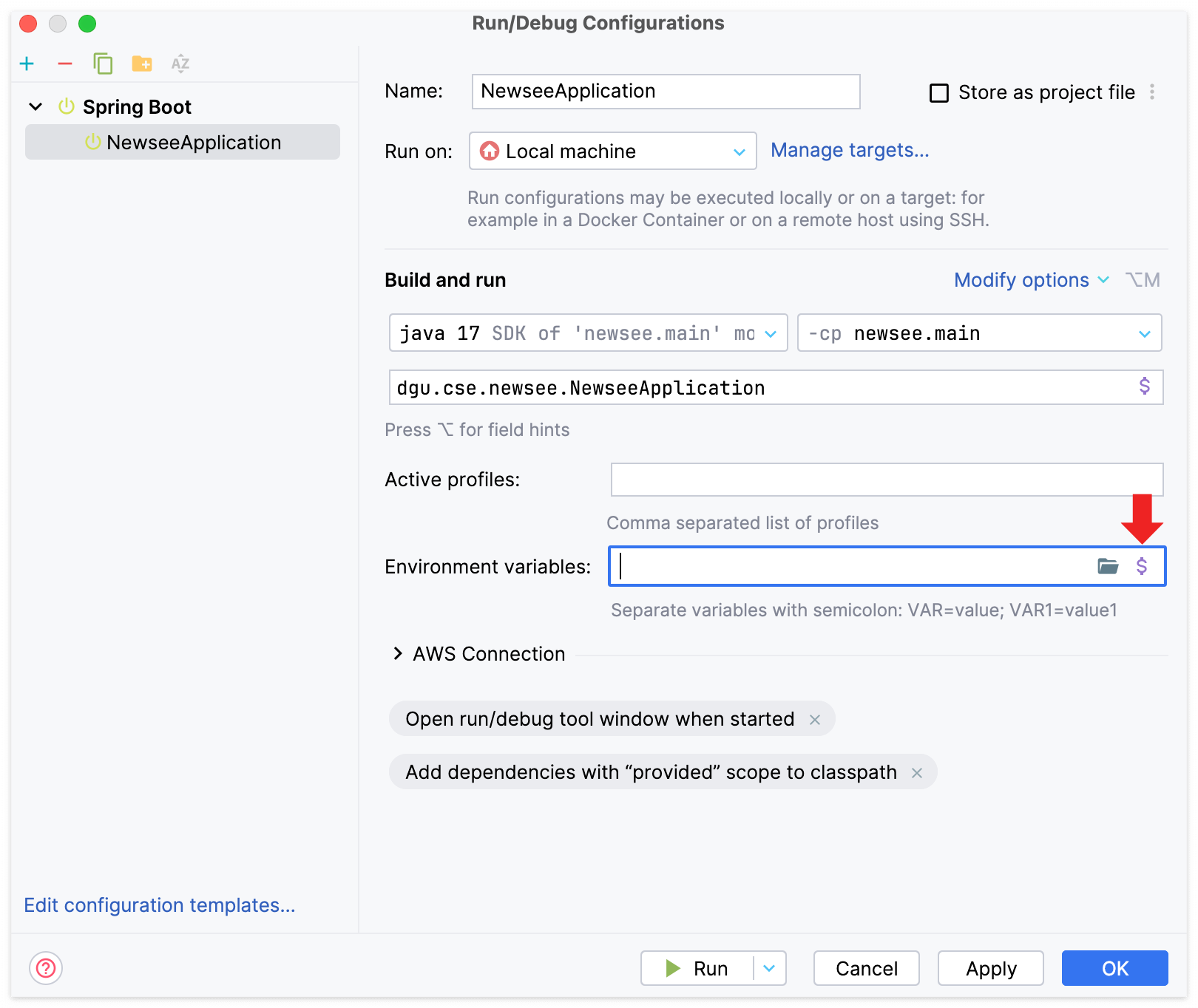 IntelliJ에서 Springboot 프로젝트를 개발할 때, 환경변수를 적용하는 방법을 알아보겠습니다.