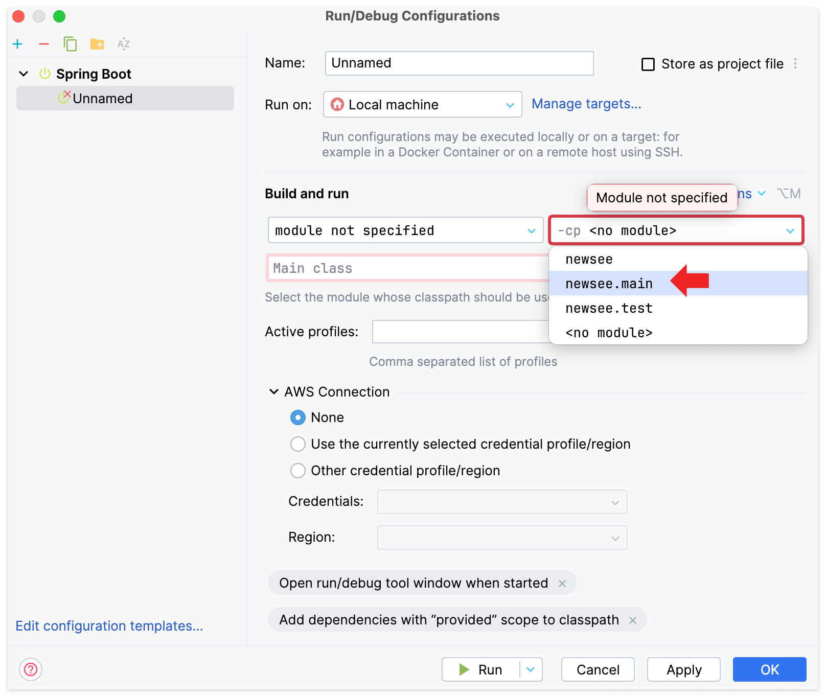 처음에는 <no module> 이라는 문구를 확인할 수 있습니다. 현재 프로젝트의 모듈을 선택합니다.
