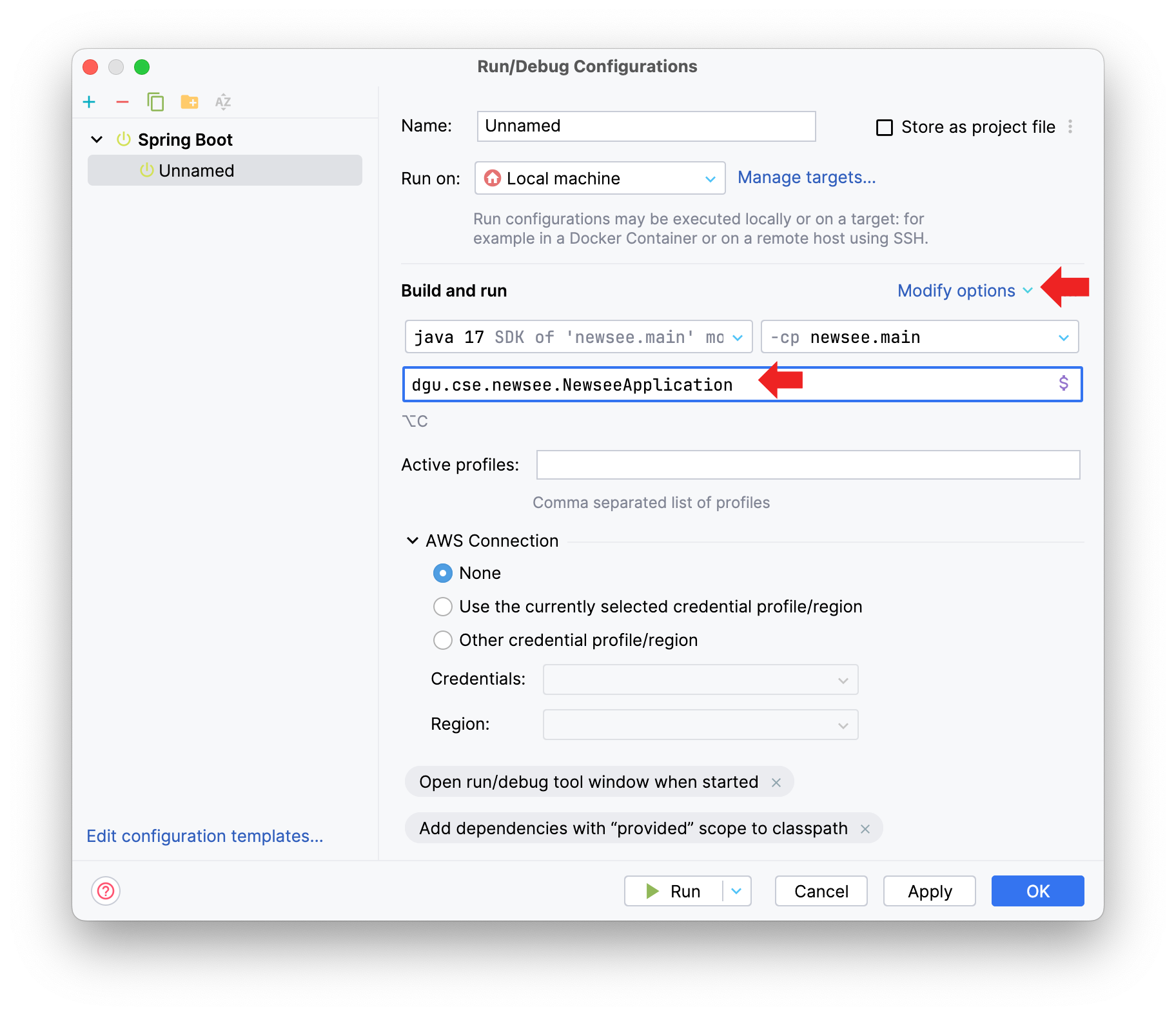 그리고 Main class의 경로를 작성하고 Modfiy options를 선택합니다.
